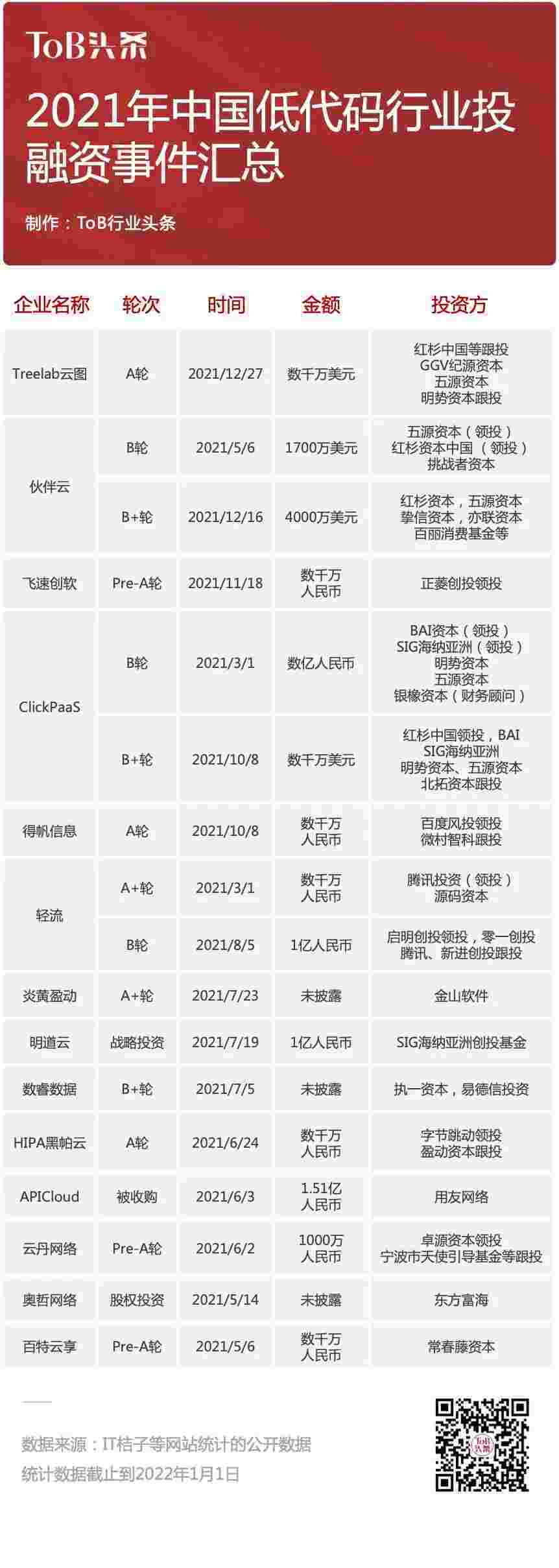 到2021年,,,,无/低代码投融资规模势头更甚,,,,其中包括轻流两轮融资(A+轮数千万人民币,,,B轮近亿人民币)、、沃钱包 两轮融资(B轮数亿人民币,,,,B+轮数千万美元)、、百特云享数千万元Pre-A轮融资......